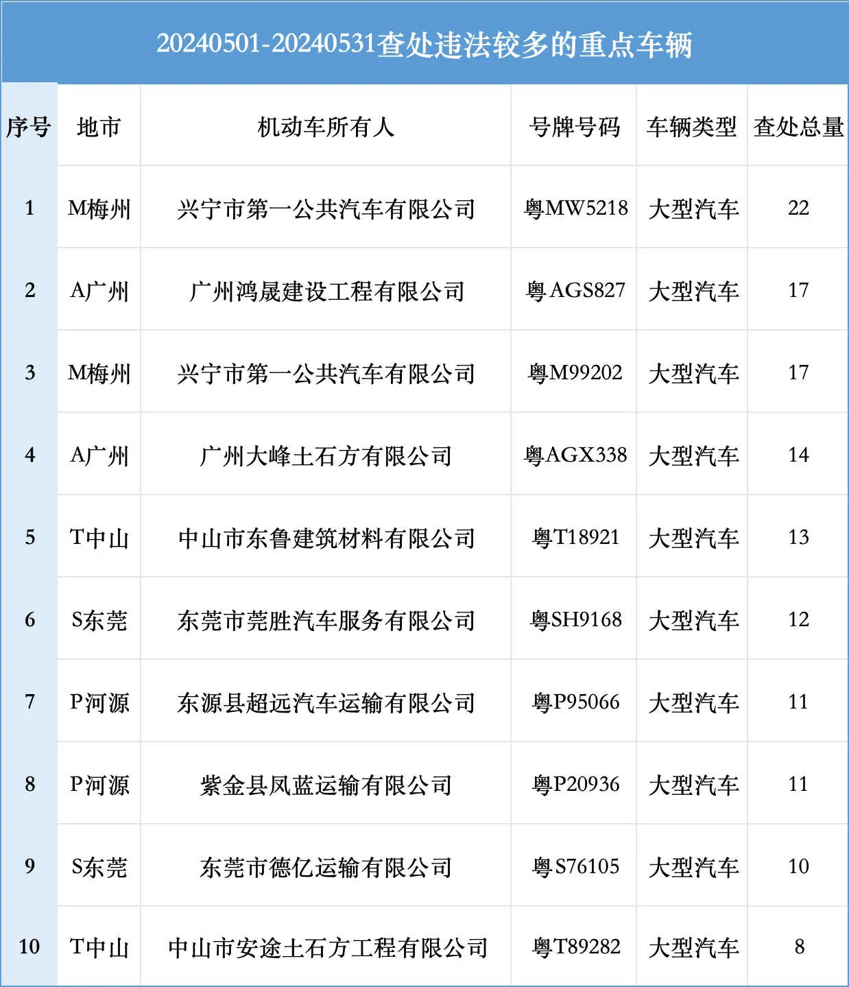 本次曝光违法次数较多的重点车辆包括:兴宁市第一公共汽车有限公司的粤MW5218、广州鸿晟建设工程有限公司的粤AGS827、兴宁市第一公共汽车有限公司的粤M99202、广州大峰土石方有限公司的粤AGX338、中山市东鲁建筑材料有限公司的粤T18921、东莞市莞胜汽车服务有限公司的粤SH9168、东源县超远汽车运输有限公司的粤P95066、紫金县凤蓝运输有限公司的粤P20936、东莞市德亿运输有限公司的粤S76105、中山市安途土石方工程有限公司的粤T89282等。