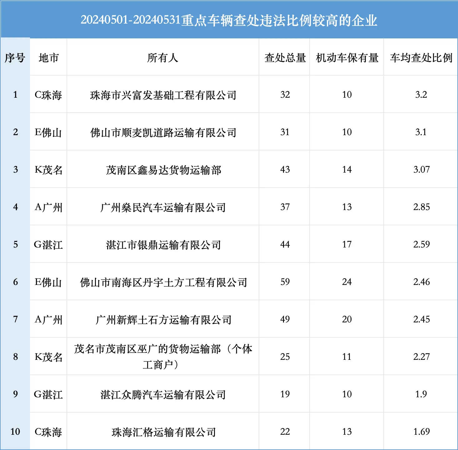 本次曝光的高风险运输企业包括:珠海市兴富发基础工程有限公司、佛山市顺麦凯道路运输有限公司、茂南区鑫易达货物运输部、广州燊民汽车运输有限公司、湛江市银鼎运输有限公司、佛山市南海区丹宇土方工程有限公司、广州新辉土石方运输有限公司、茂名市茂南区巫广的货物运输部(个体工商户)、湛江众腾汽车运输有限公司、珠海汇格运输有限公司10家。
