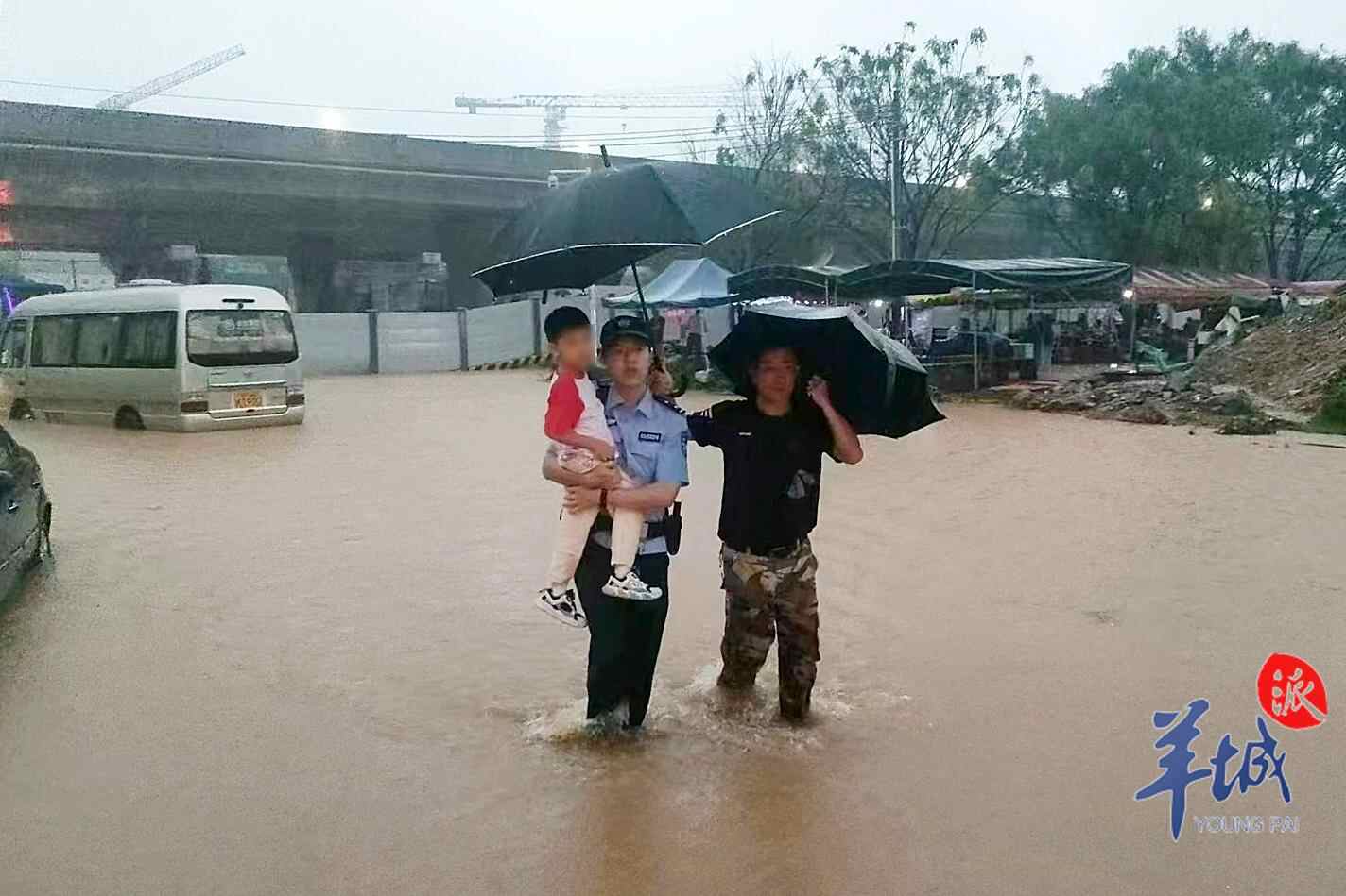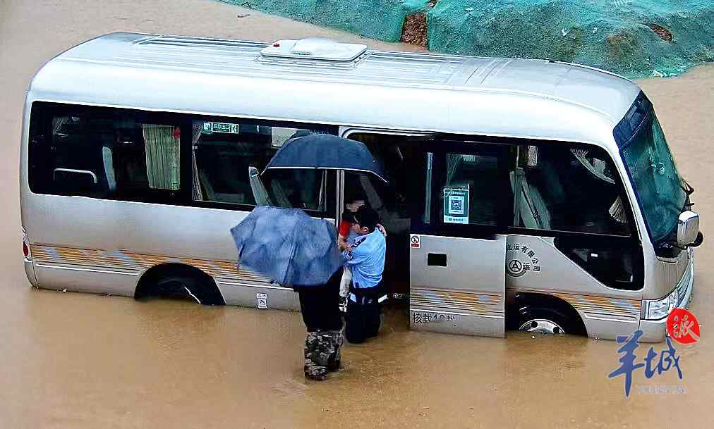 行进至中巴车位置时,民警发现司机及一名幼童仍未安全撤离。眼见暴雨越下越大,水越积越深,民警立即脱掉鞋袜涉水徒步走到中巴车门边,让司机赶紧打开车门,民警抱出幼童,慢慢蹚水上岸。
