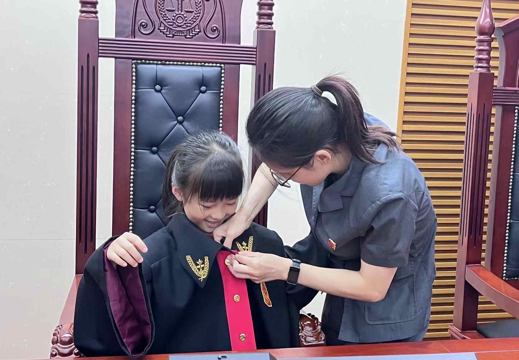 “现在谁想来体验一下当小法官的感觉呢?”台下的小朋友们早已按捺不住,纷纷踊跃举手,大家穿上法袍,坐上审判席,敲响法槌,沉浸式体验法庭的庄严肃穆。