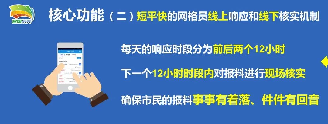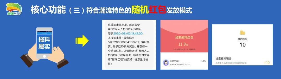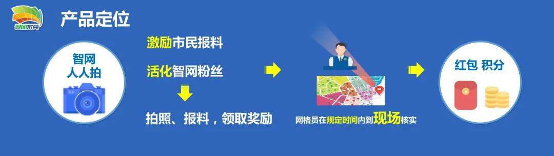 线上报料有奖,线下响应处置。打开微信小程序搜索“智网人人拍”即可进入小程序界面。“智网人人拍”建立了覆盖线上线下的问题隐患响应和处置闭环。在线上,小程序与“智网工程”信息系统、政务资源信息共享平台无缝对接,实现了隐患线索从市民到网格管理员再到入格部门的自动流转交办和结果反馈。东莞市财政局还设立了专门的奖励资金用于鼓励市民报送线索;在线下,小程序配套的工作制度也将确保网格管理员、各入格部门对市民报送线索的及时响应和有效处置。