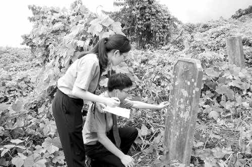 这是广州军事检察院会同广东省台山市检察院针对散葬烈士墓问题成立联合办案组后,第二次寻找烈士墓。第一次上山时,由于通往墓地的路常年没有人走动,野草长得比人还高,灌木丛交错林立,几百米的距离,大家转悠了一个多小时,还是没有找到地方。这一次,在当地热心村民的帮助下,检察官们用开山刀砍出了一条简易小路,才艰难到达现场。