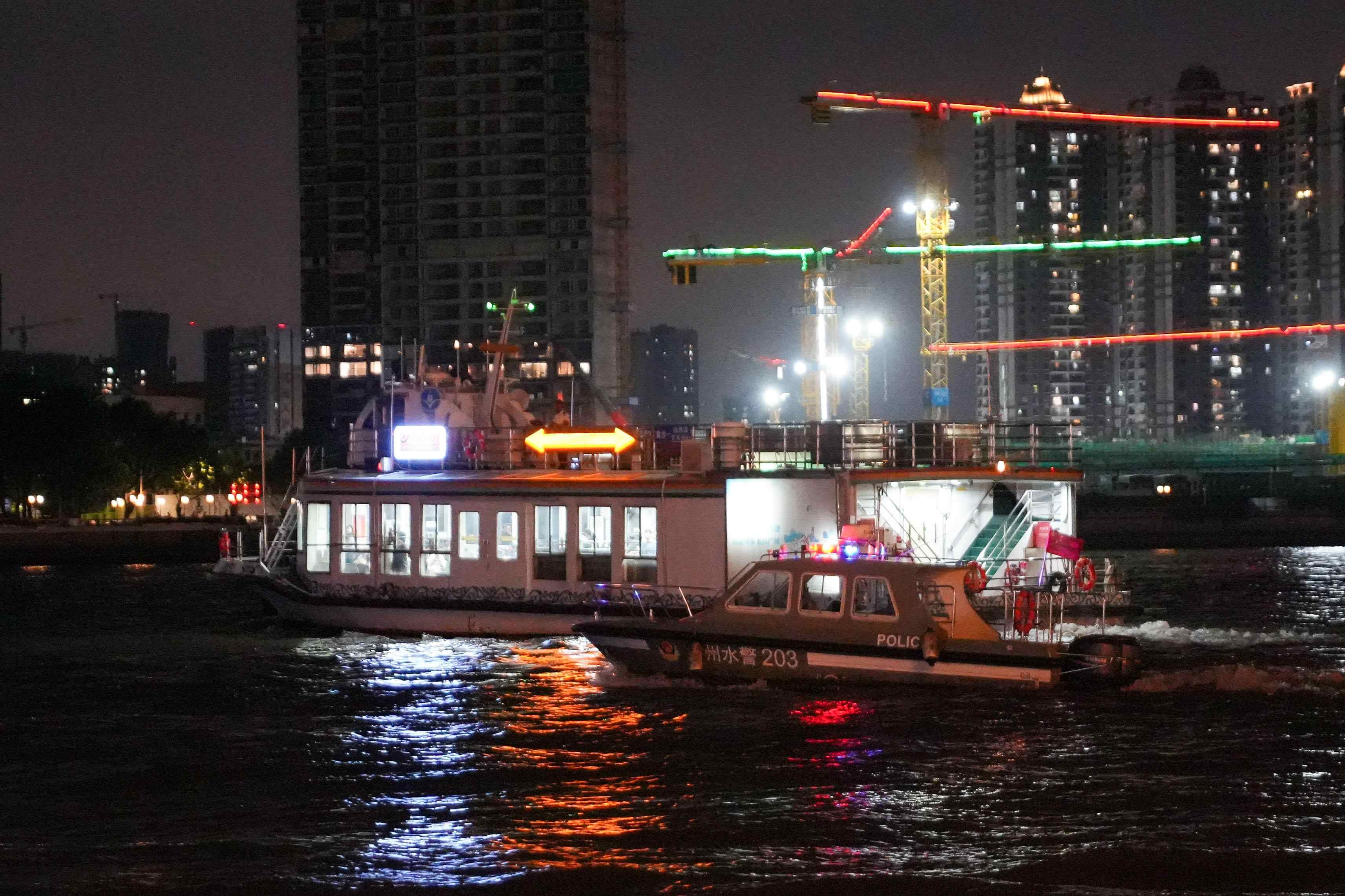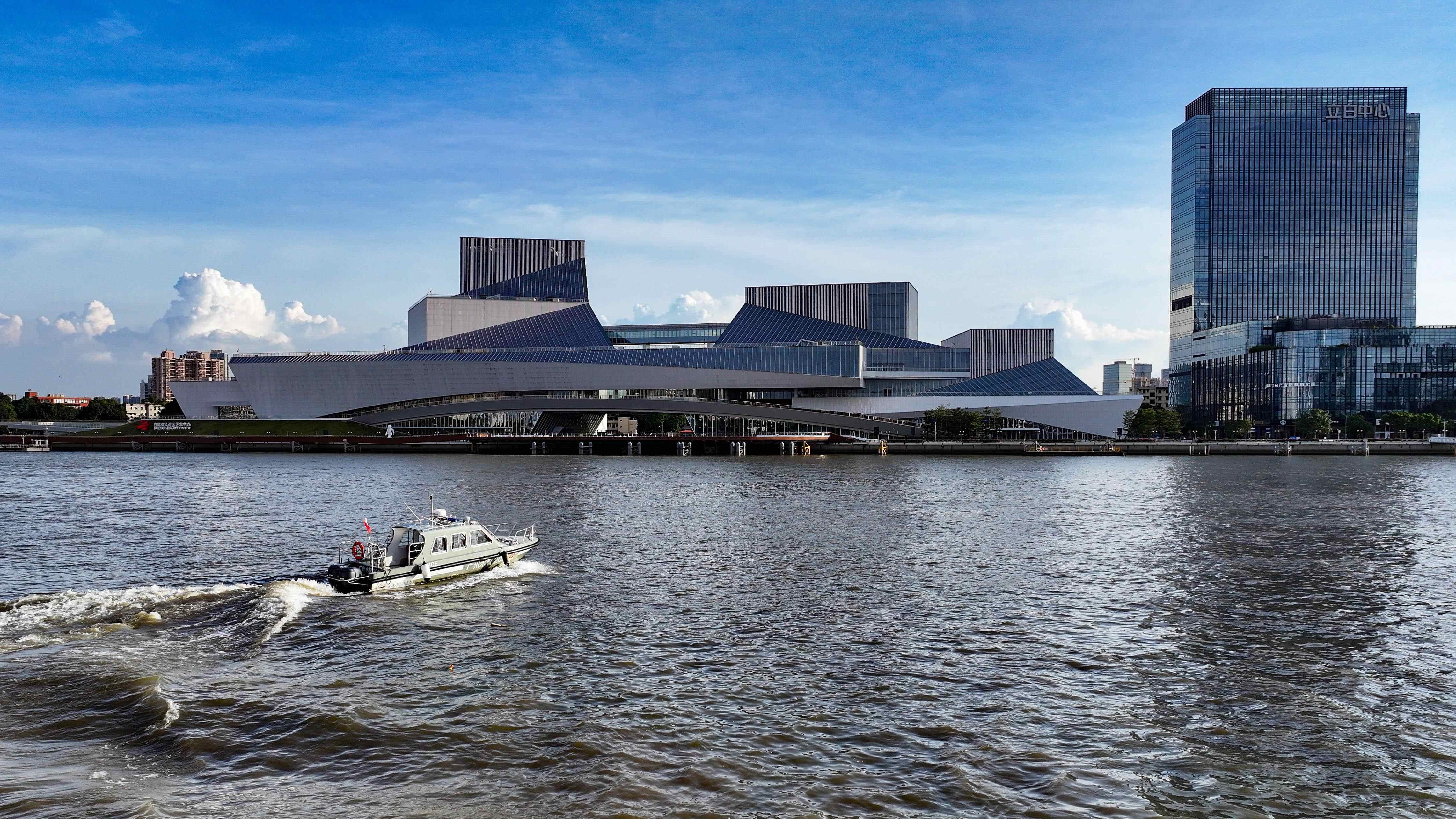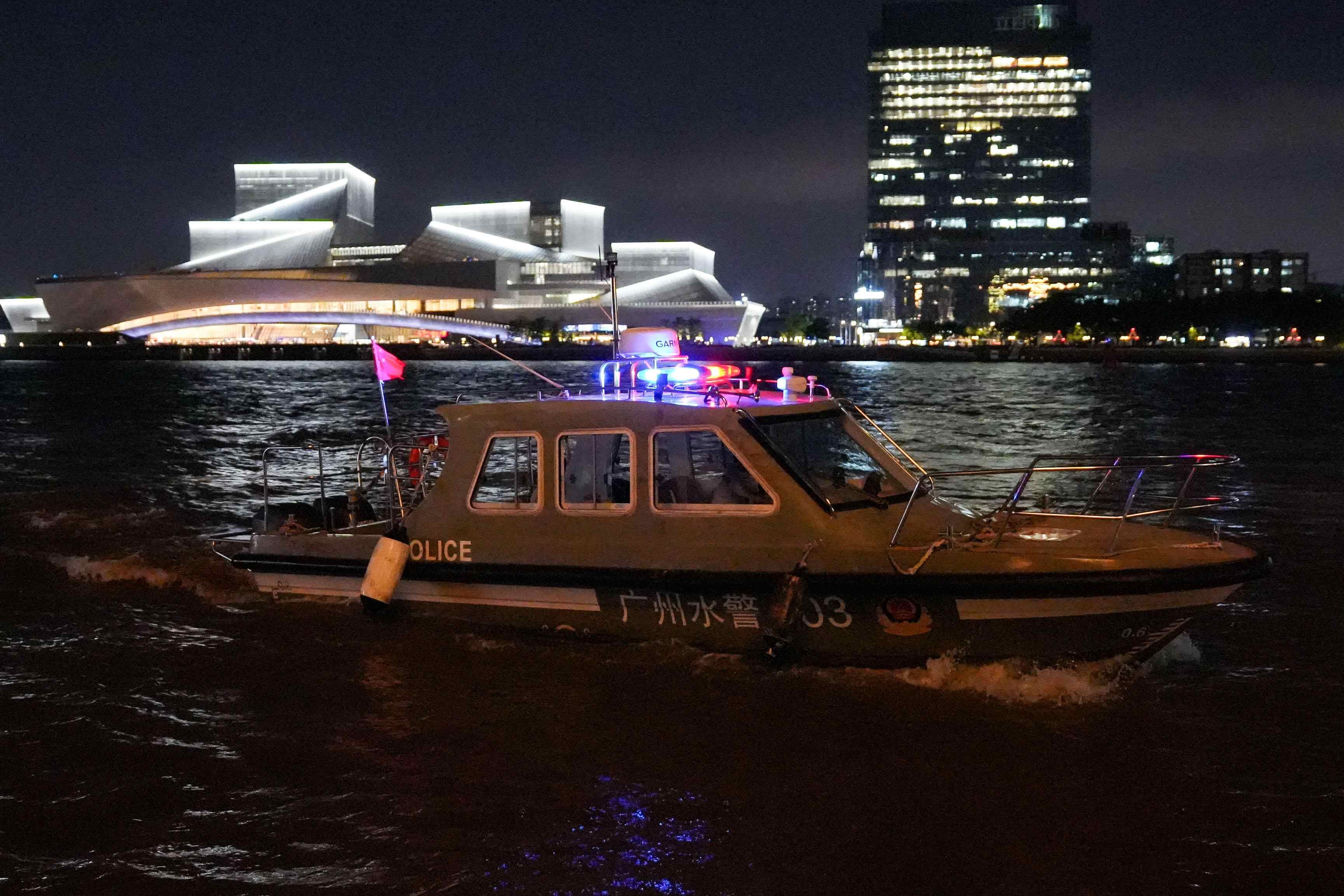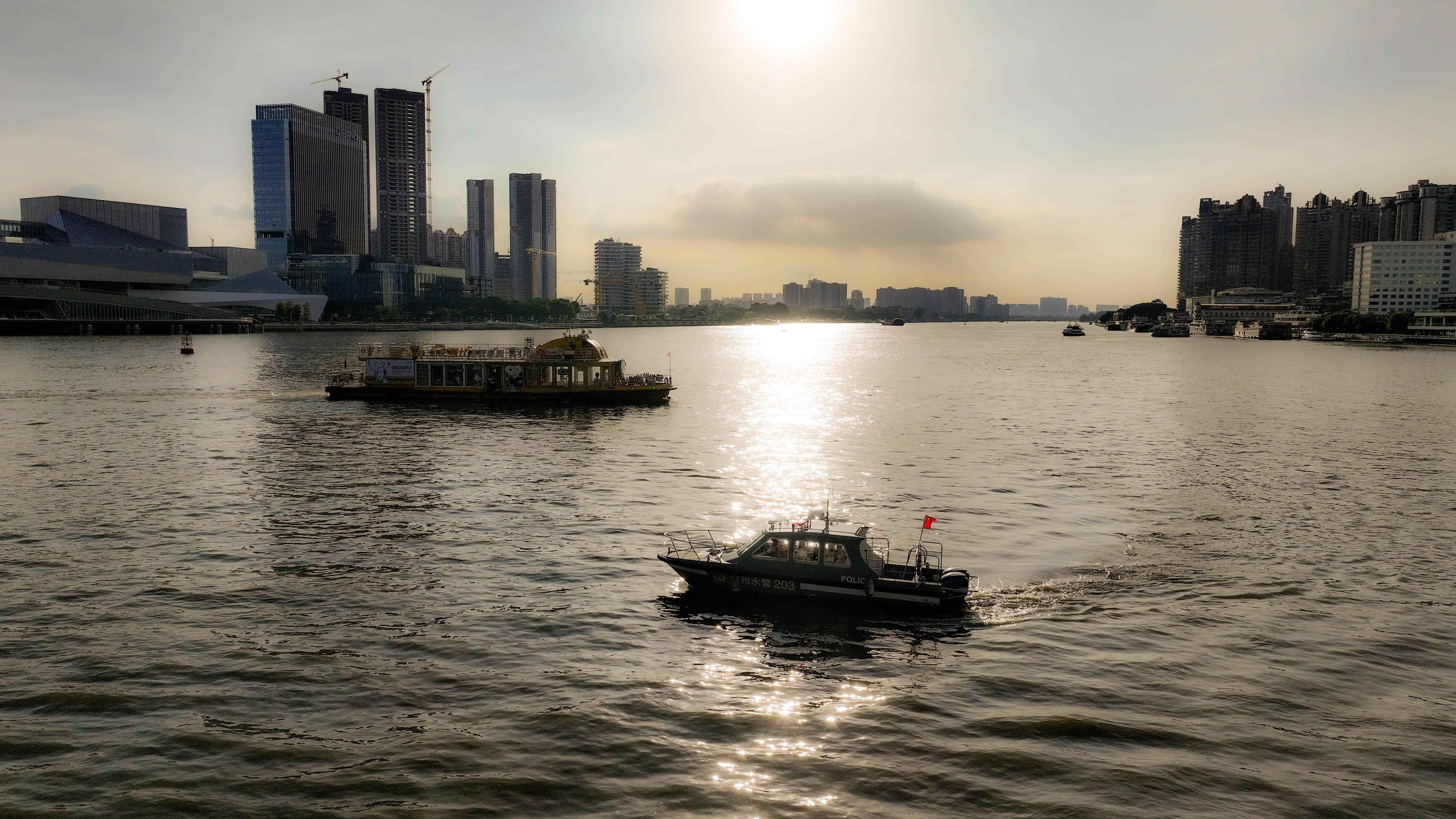 花地口派出所水警船在白鹅潭大湾区艺术中心附近水域巡逻
