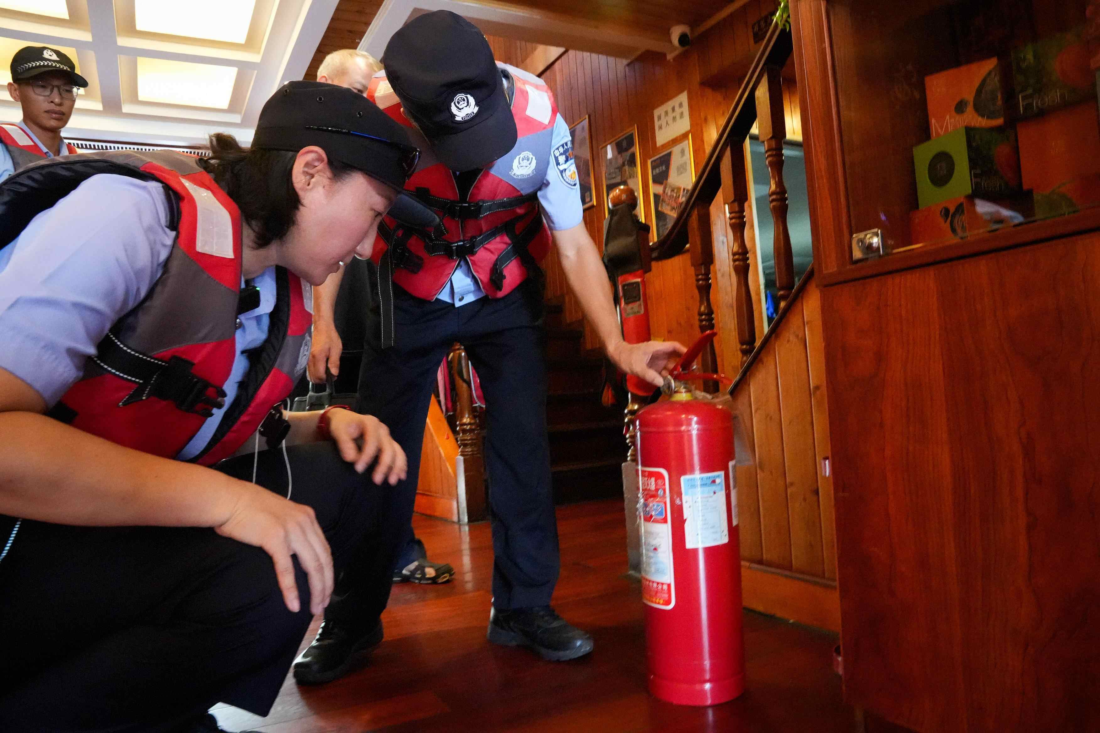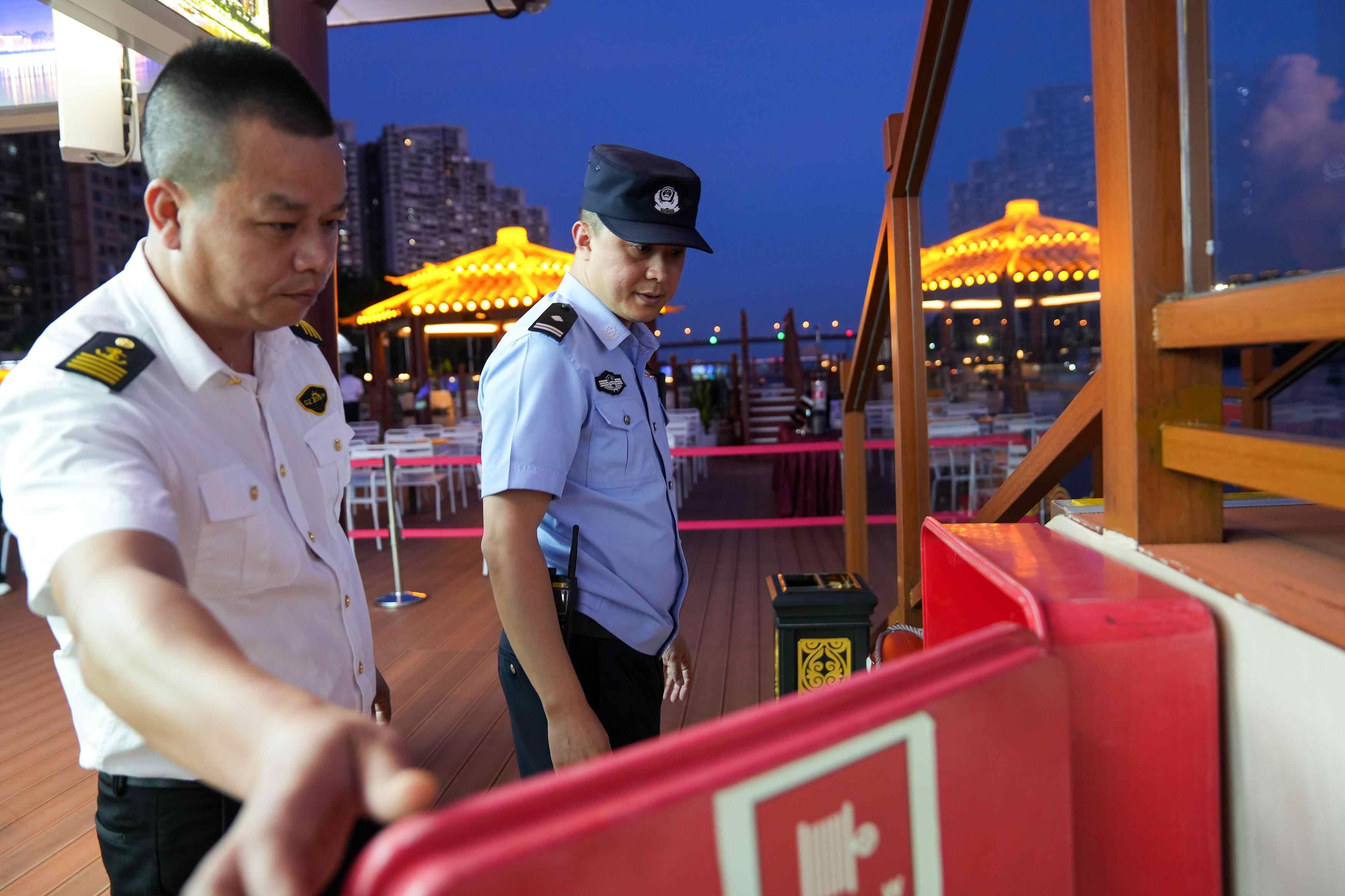 花地口派出所副所长陈楷龙(右)带队检查游船消防安全设施