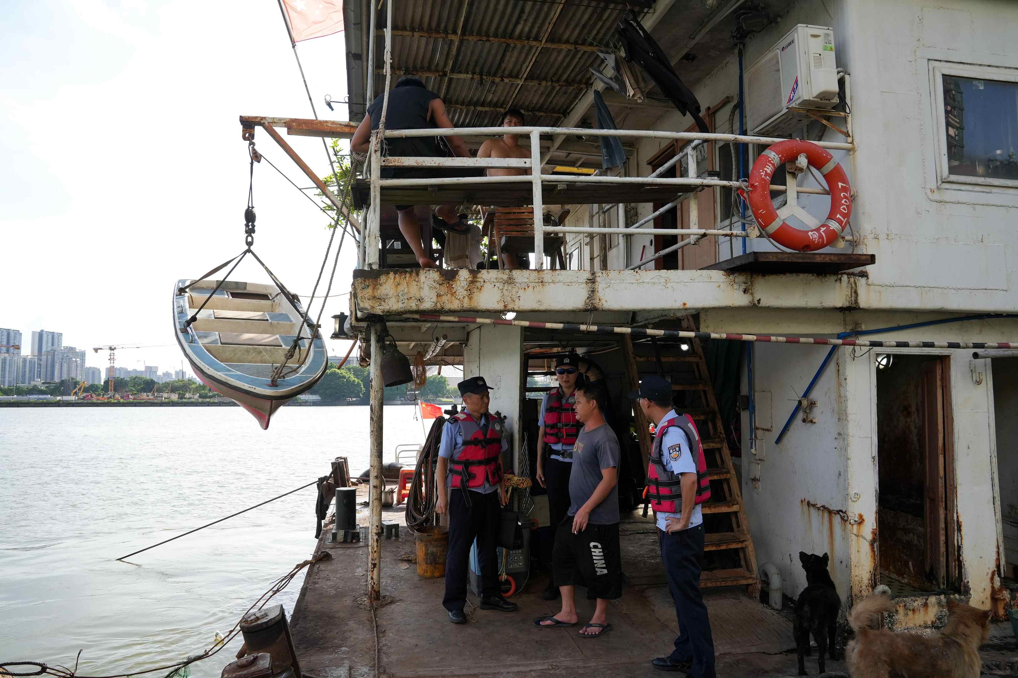 花地口派出所民警谢志坚(左一)向船只负责人强调说明消防措施的重要性