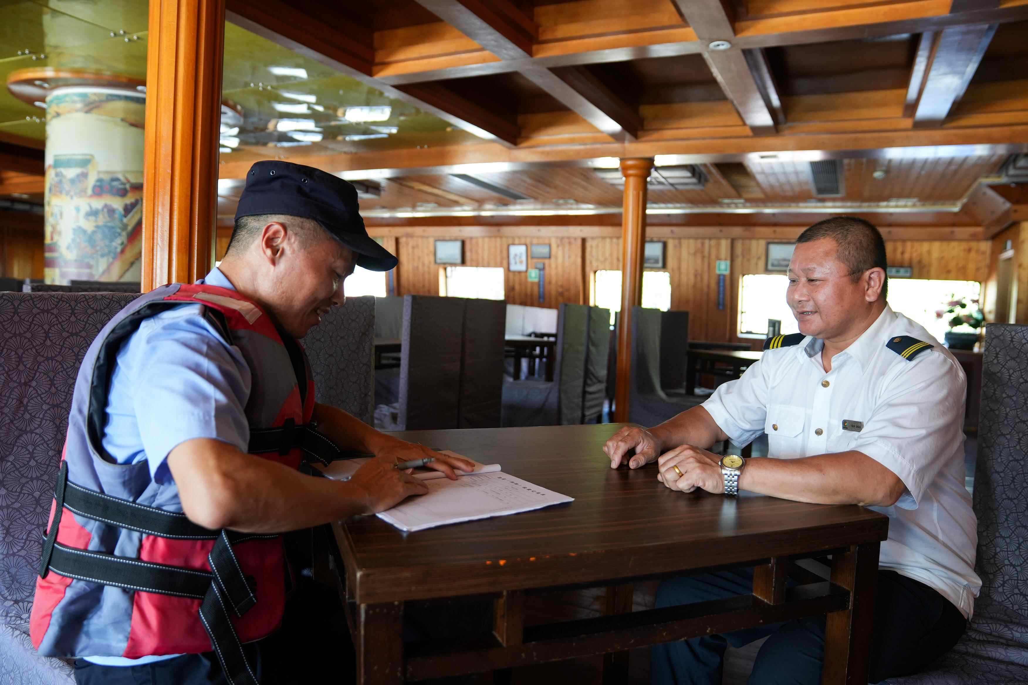 花地口派出所民警谢志坚(左)给船只负责人开具治安(消防)检查记录表