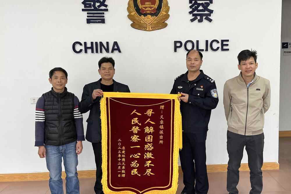 12月1日上午,河源市紫金县义容镇东平村的廖先生专程来到紫金公安义容派出所,将一面印有“寻人解困感激不尽 人民警察一心为民”的锦旗送到民警手中,对民警及时帮助找回走失亲人表示由衷的感谢。
