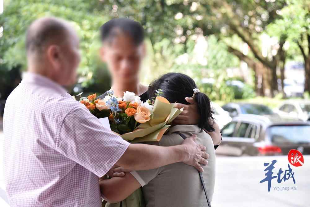 7月1日上午,在广州市公安局从化区分局大楼前,徐先生、罗女士与失散多年的儿子相拥而泣。