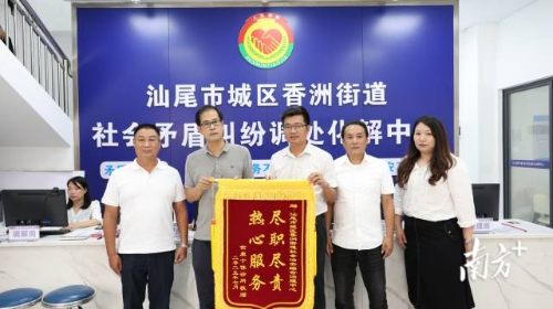 7月24日,某诊所王医生手捧着一面写有“尽职尽责 热心服务”的锦旗,送到汕尾市城区香洲街道社会治安综合治理中心,以此感谢该中心化解了一起医患纠纷。