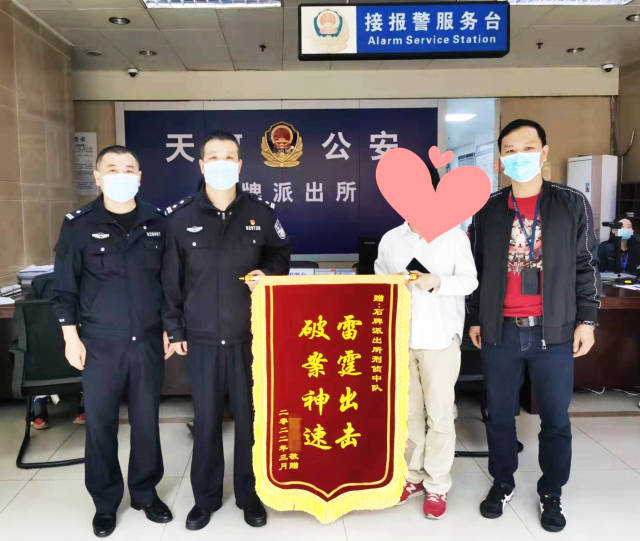 为表达谢意,报警人陈女士来到石牌派出所,送上一面印有“雷霆出击,破案神速”字样的锦旗。