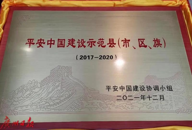 12月15日上午,平安中国建设表彰大会在北京举行,平安中国建设140个先进集体、129名先进个人受到表彰,授牌命名60个平安中国建设示范市和160个平安中国建设示范县,授予73个市县“长安杯”。其中,广州市天河区获评“平安中国建设示范县(市、区、旗)”,为广州市唯一。