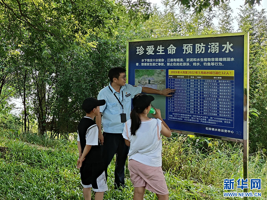 网格管理员陈镇海向群众讲解擅自野外游泳的风险。