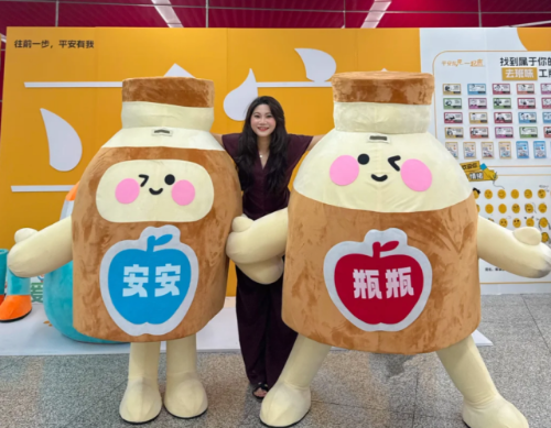 线下,“瓶瓶”“安安”与“平安小精灵”等IP巨型人偶举牌互动,或包装成抱抱柱的毛绒触感,传递暖意,成为市民“合影新宠”;“刮刮乐”“星期工牌”“姓氏卡片”等文创设计,以去班味的幽默口吻拉近与年轻人的距离,不止释放即时情绪,更传递“你的情绪我懂”的共鸣。