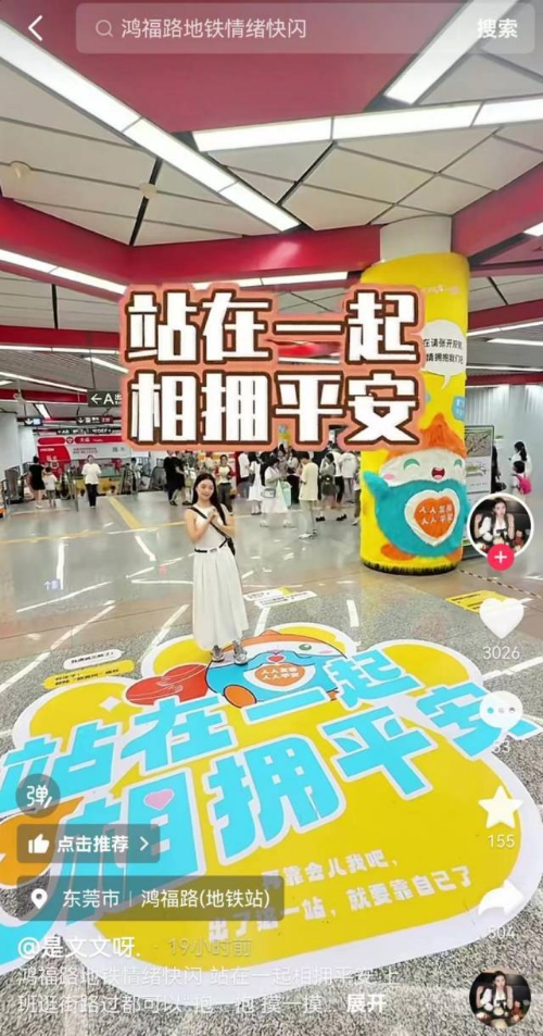线上也同步掀起“平安打卡热”。小红书上,这场快闪被网友比作心灵充电站,“好久没有在商圈看到这么用心的设计”“东莞地铁也太会治愈了”等评论如潮。朋友圈、短视频平台上,“平安东莞,一起来”标签话题持续更新,让网络传播承载温情与正向价值。